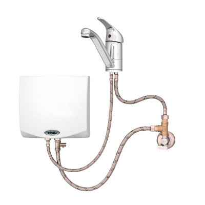 Tlakové prevedenie elektrického prietokového ohrievača vody HAKL MK-1 umožňuje zapojenie aj na bežnú stojankovú vodovodnú batériu.