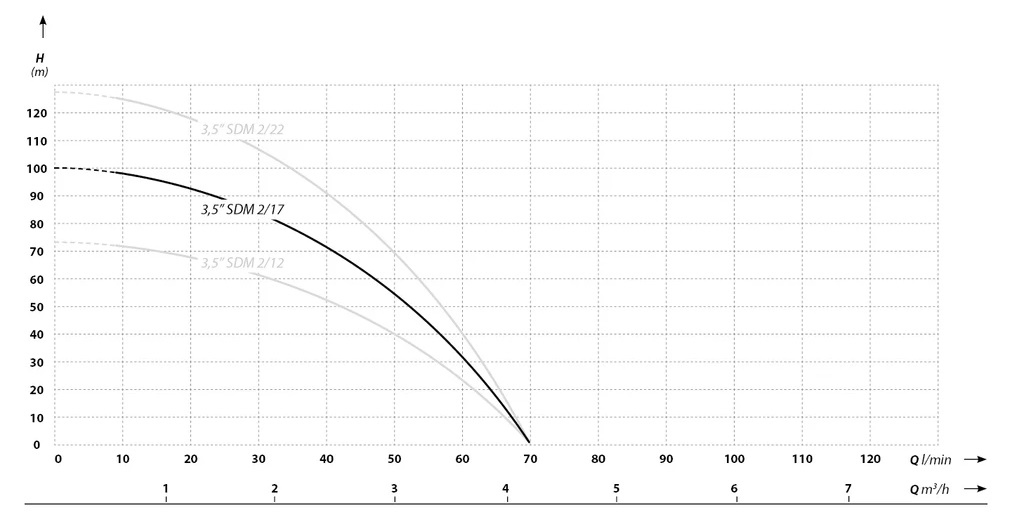 Viacstupňové hlbinné čerpadlo 3,5" SDM sa vyznačuje zvýšenou odolnosťou voči abrazívnym látkam. Vďaka plávajúcim obežným kolesám a použitím odolných materiálov pri výrobe, je vhodné aj do čerstvých vrtov a studní, pre zásobovanie rodinných domov, fariem, priemyselných objektov, zavlažovanie záhrad a pod., alebo ako súčasť domácej vodárne s ponorným čerpadlom. Čerpadlo je vybavené tepelnou ochranou. Vysoká účinnosť a hospodárnosť prevádzky vzhľadom k priemeru čerpadla umožňuje široké využitie. K dispozícii v rôznych veľkostiach a výkonoch pre optimálnu prevádzku v závislosti od potrieb zákazníka.
