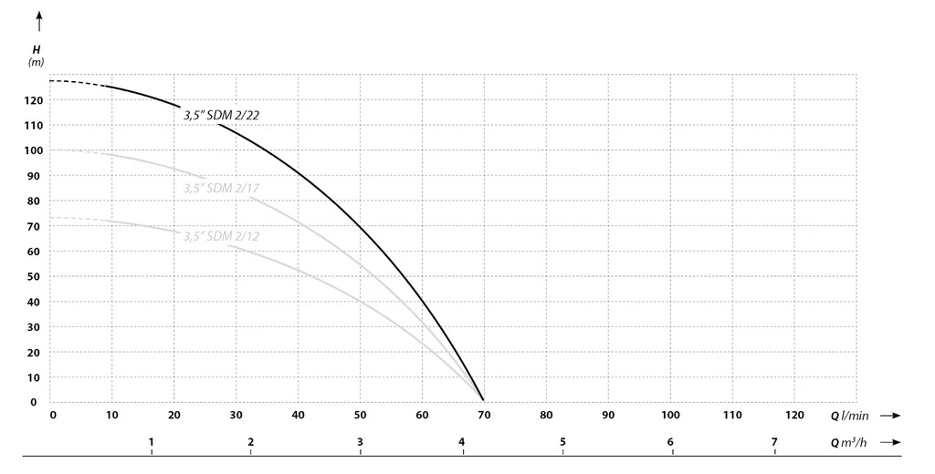 Viacstupňové hlbinné čerpadlo 3,5" SDM sa vyznačuje zvýšenou odolnosťou voči abrazívnym látkam. Vďaka plávajúcim obežným kolesám a použitím odolných materiálov pri výrobe, je vhodné aj do čerstvých vrtov a studní, pre zásobovanie rodinných domov, fariem, priemyselných objektov, zavlažovanie záhrad a pod., alebo ako súčasť domácej vodárne s ponorným čerpadlom. Čerpadlo je vybavené tepelnou ochranou. Vysoká účinnosť a hospodárnosť prevádzky vzhľadom k priemeru čerpadla umožňuje široké využitie. K dispozícii v rôznych veľkostiach a výkonoch pre optimálnu prevádzku v závislosti od potrieb zákazníka.