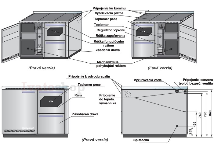 Nehrdzavejúci oceľový rám panelu ohrievania/ Tri alternatívy pripojenia ku komínu/ integrovaná zásobáreň dreva./ Dvere bojlera, Termomanometer, Regulátor odvodu/ Pripojenia pre vyhrievací systém, Ochrana termálnych pripojení